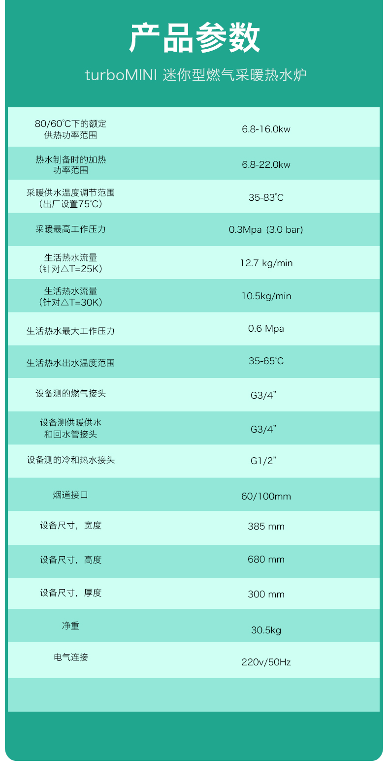 两用炉:小采暖,大热水(16kw采暖/22kw热水),满足采暖及热水的不同需求